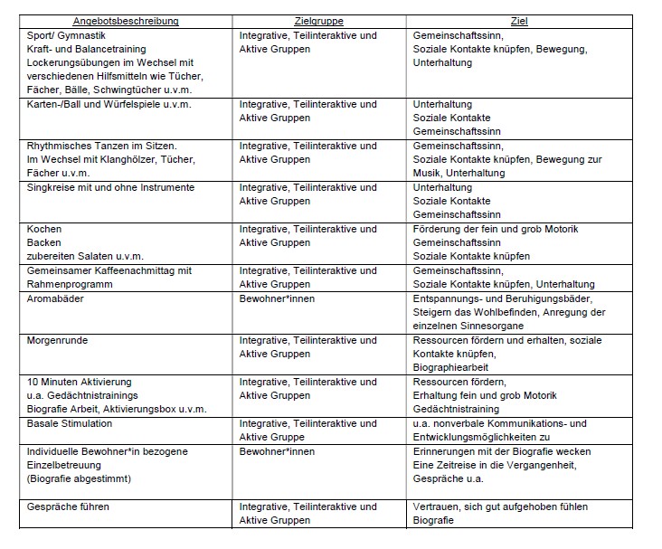 - Sicherung und Steigerung der Lebensqualität unserer Bewohner*innen durch die soziale, physische und kognitive Ansprache.